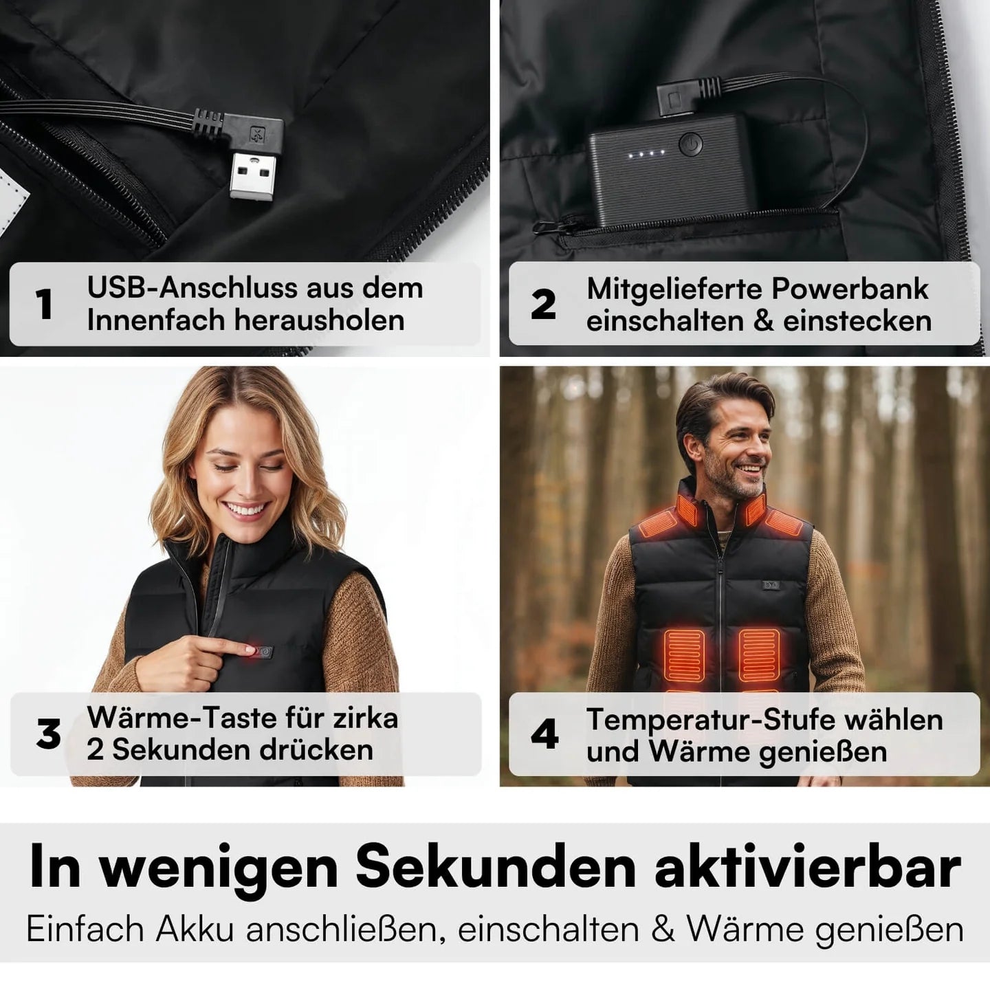 Die mitgelieferte Powerbank liefert bis zu 12 Stunden konstante Wärme. Ob Winterspaziergang. Weihnachtsmarkt oder Outdoor-Job- Du bleibst warm, ohne jemals frieren zu müssen.